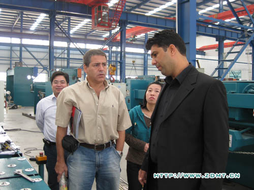 稍事休息,Atila Deniz先生和Mr.Tunc便帶著迫切的心情參觀了中德的各個(gè)車(chē)間。從裝備車(chē)間到大件車(chē)間,至電焊車(chē)間再到金工車(chē)間。客人對(duì)中德產(chǎn)品表現(xiàn)出濃厚的興趣,提出的問(wèn)題也是相當(dāng)專(zhuān)業(yè)、細(xì)致。比如,機(jī)床使用材料的鋼號(hào),數(shù)控系統(tǒng)的工作效率等等,無(wú)不體現(xiàn)出一個(gè)機(jī)床消費(fèi)成熟國(guó)的高標(biāo)準(zhǔn)。